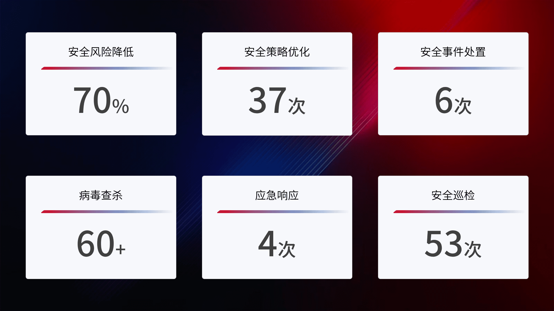 提供全面的安全事件报告体系,,,包括处置报告、、、、周报、、、季度和年度总结,,,,结合持续监控,,帮助客户深入了解网络安全状况。。。