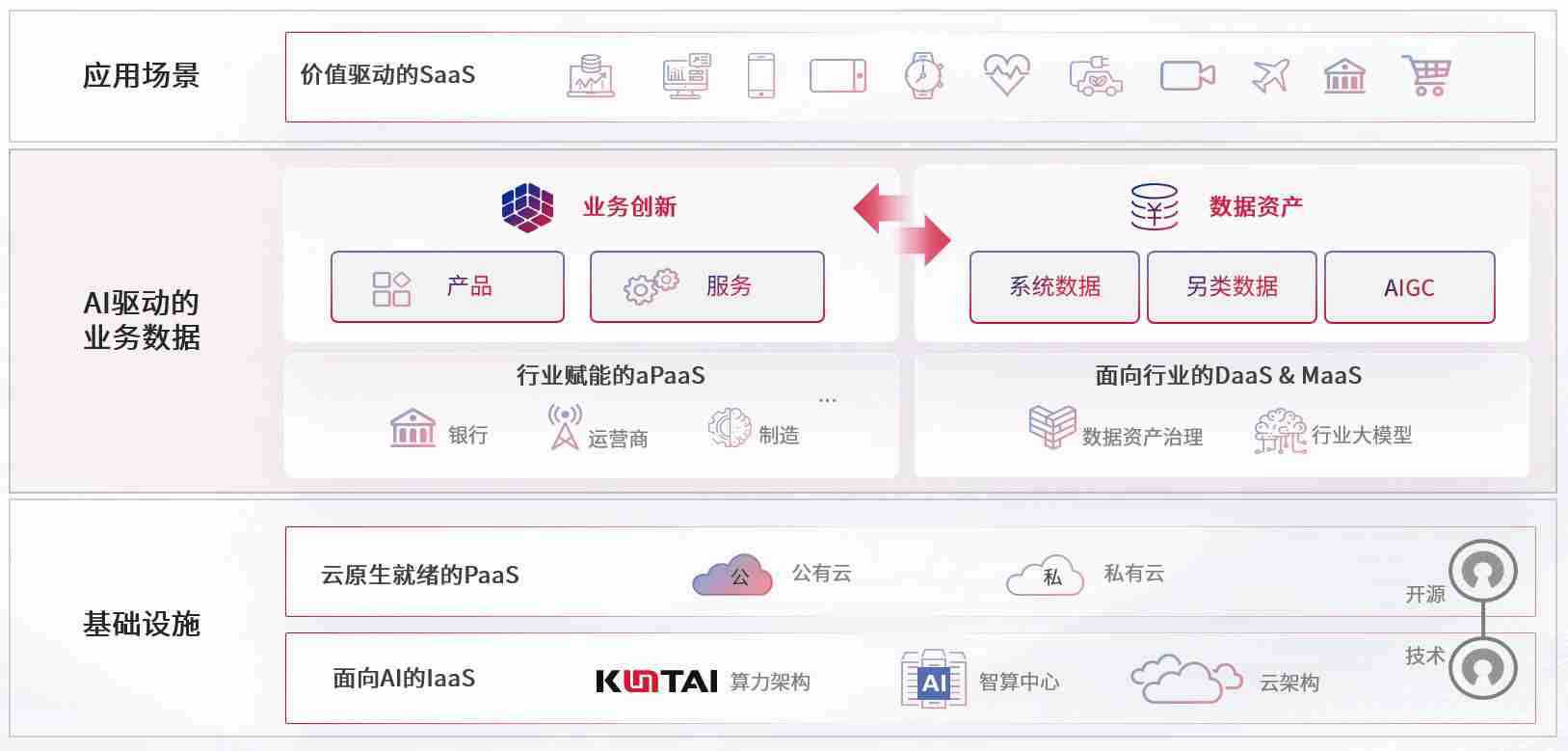 在基础设施层面,,基于商业或开源的云原生就绪开发工具与技术组件(PaaS)和面向AI的底层公共基础设施资源(IaaS),,,将共同支撑企业完成数字化转型